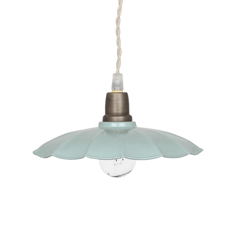 Liten taklampe med vakker bølgete kant. Lampeskjerm i lakkert metall, sokkel i messing med beige tvunnet tekstilledning. Passer med E14-pære, maks 40W. Pære ikke inkludert. Ledningslengde: 1,5 m, ingen strømbryter eller stikkontakt.