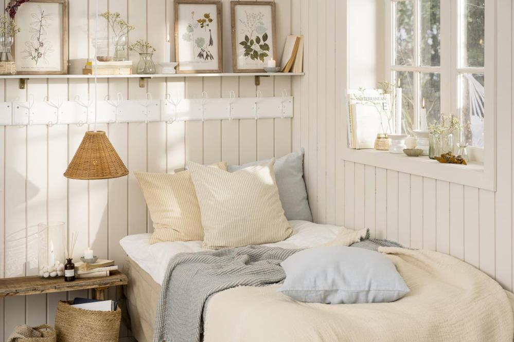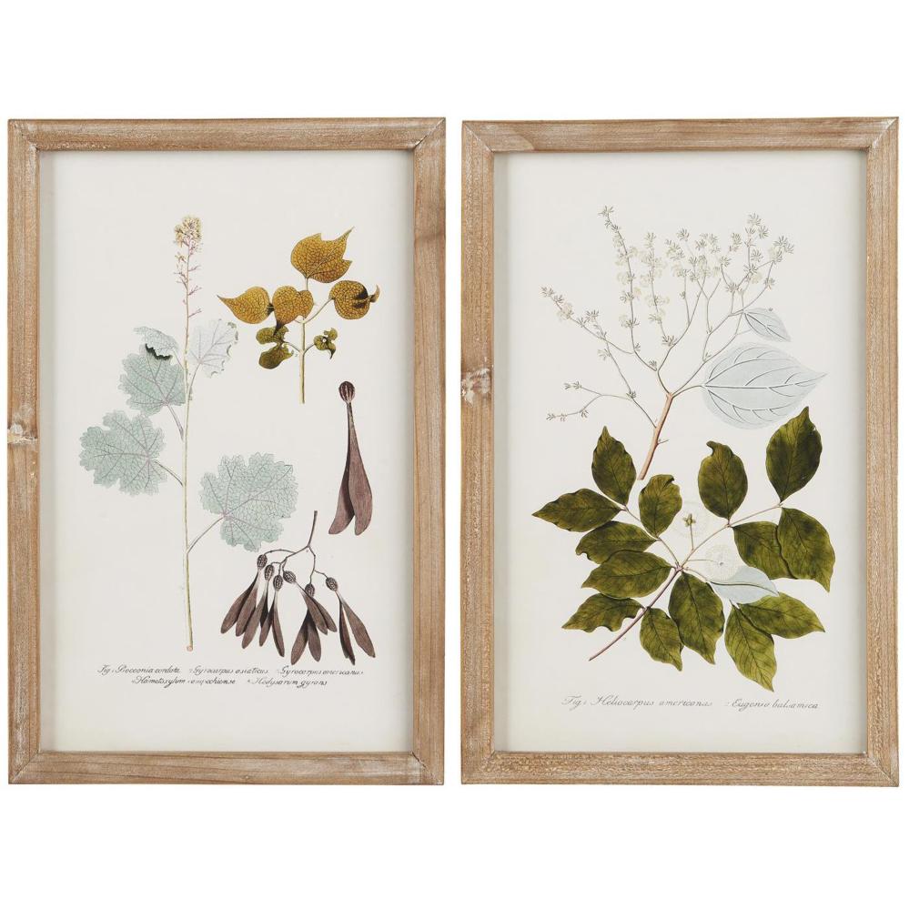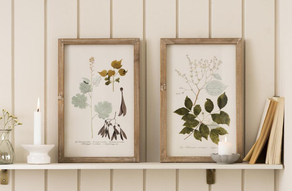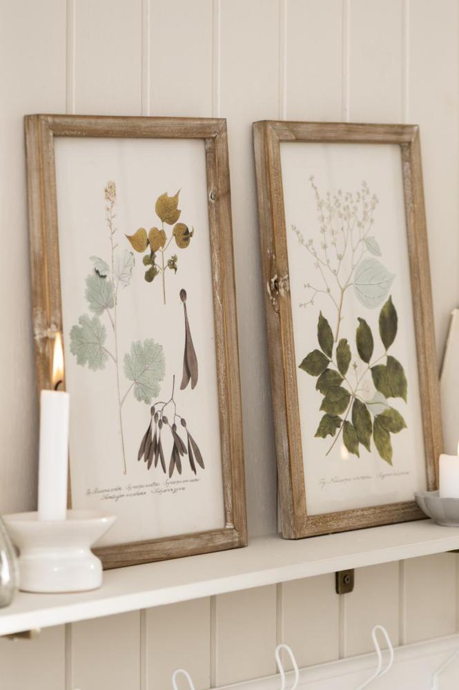 Vakker bilde med en smal ramme av furu og med plante motiv - klar til å henges på veggen.