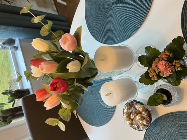 Älskar tulpaner men eftersom vi har katt blir det inga hemma. Letat länge efter verklighetstrogna men inte hittat ngr bra. Funderade länge om jag skulle våga testa att köpa utan att se dem först. Köpte tillslut vita, ljusrosa och rosa för att ha i en bukett med eukalyptus. Blev positivt överraskad, men man ser fortfarande att de inte är riktiga, tom sambon såg det. De borde vara mer gummiaktiga för att upplevas riktiga. Nu är de bara väldigt matta, både i kronblad och blad. Men gillar att de är i olika stadier för det är mer verklighetsnära.