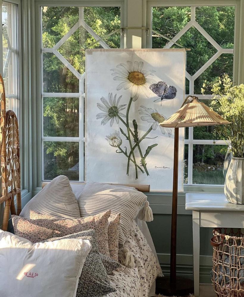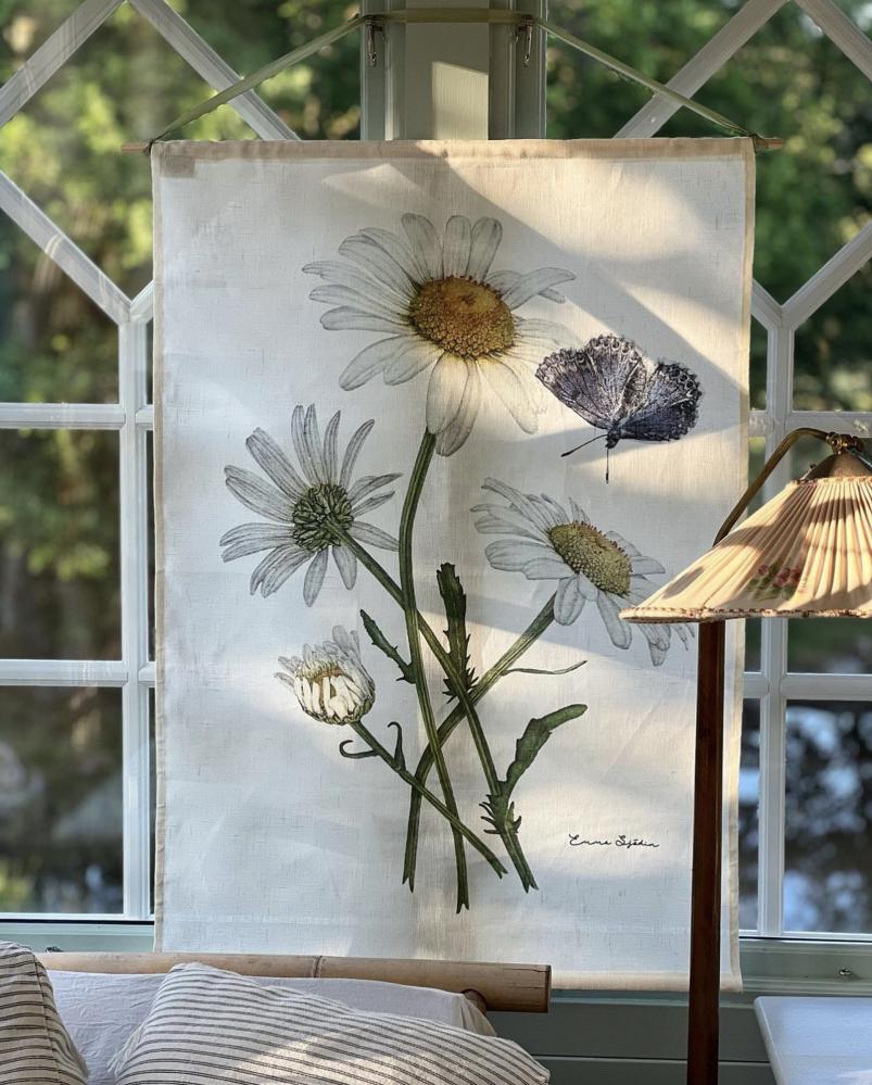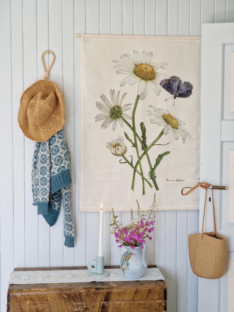 Kollektion 'Præstkragar & Blåvinge' ingår i Emma Sjødins botaniska serie av vilda skandinaviska blommor og vackra insekter. Emma har hær kombinerat sina favorittekniker blyerts & akvarell og skapat detaljerade tidløsa bilder. Målsættningen har varit att på ett konstnærligt sætt visa blommans uppbyggnad i knoppar, utslagna blommor, dess stjælk og bladens utformning. Førlagorna kommer fra egna studier og kompositioner av blommor fra sommarængarna i Småland vid gården Frøvik. Humlan på bilden tillhør familjen åkerhumlor og återfinns på ængar, skog, parker og trædgårdar.