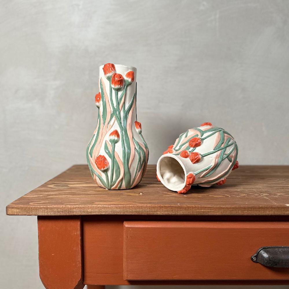 Håndmalt vase i fargene grønt og rød/oransje. Vasen tilhører vår nye serie Botanica.