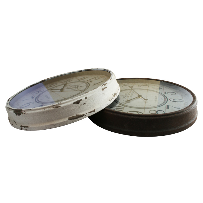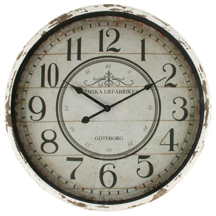 Riktig stor og vakker veggklokke i vintagestil. Hvitt slitt og vakkert! Passer både i hjem med shabby-, landlig- og industriell stil. Denne klokken blir en fin dekorasjon på veggen i kjøkkenet, stuen eller hvorfor ikke på soverommet? Et virkelig veggsmykke. Krever 1 stk AA-batteri (ikke inkludert). Mål: Ø51,5 og 8 cm i høyden.