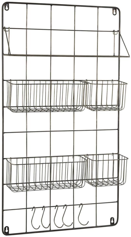 Perfekt veggoppbevaring å ha på kjøkkenet, i gangen eller på kontoret. Passer til notatbøker, brev, bilder eller krydder. Laget av metall og har en hylle, fire kurver i to størrelser og fem kroker.